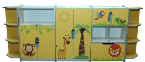 Стінка дитяча "Звірята" №9 з двома малими дверима і шухлядою Габаритні розміри: 600х300х950мм. Вага: 26,44 кг. Матеріал: корпус, полиці, двері - ДСП ламінована, товщина 16 мм. Задня стінка: ДВП ламінована біла 3 мм. Фасад з фотодруком, оклеєний крайковою стрічкою ПВХ - 1 мм, інші елементи - ПВХ 0,5 мм. Стінка напівзакритого типу з малими дверями та шухлядою, на 5 відділень. Має фігурні вирізи та елементи. Колір ДСП: беж/жовтий, беж/лайм.