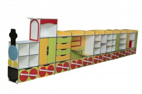 Стінка дитяча "Казковий експрес" Габаритні розміри: 6670х350х1130мм. Вага: 308,10 кг. Матеріал: корпус, полиці - ДСП ламінована, товщина 16 мм. Задня стінка: ДВП ламінована біла 3 мм. Фасад оклеєний крайковою стрічкою ПВХ - 1мм; інші частини ПВХ - 0,5 мм кольору "алюміній". Фасади оздоблені тематичними МДФ накладками червоного, жовтого, синього та чорного кольорів. Колір: білий, жовтий, лайм, червоний.