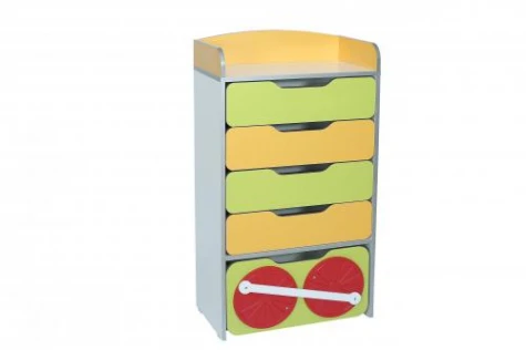Стінка дитяча "Казковий експрес" елемент №2 Габаритні розміри: 620х350х1130 мм. Вага: 37,00 кг. Матеріал: корпус, полиці - ДСП ламінована, товщина 16 мм. Задня стінка: ДВП ламінована біла 3 мм. Фасад оклеєний крайковою стрічкою ПВХ - 1 мм; інші частини - ПВХ 0,5 мм кольору "алюміній". Фасади оздоблені тематичними МДФ накладками червоного та білого кольорів. Колір ДСП: білий, жовтий, лайм.