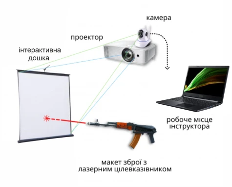 Це програмно-апаратний комплекс, за допомогою якого вчитель може ефективно формувати в учнів навички прицільної стрільби. Комплекс складається з набору вправ для базової вогневої підготовки, тренування швидкості реагування та влучності. Комплектація: програмне забезпечення, камера з інфрачервоним фільтром, пневматичний пістолет з вбудованим лазерним цілевказівником, макет автомата з вбудованим лазерним цілевказівником, проєктор (від 3000 лмн) з кріпленням, ноутбук, інтерактивна дошка. Для відпрацювання вправ з гранатометом є можливість поставки монокуляру.
