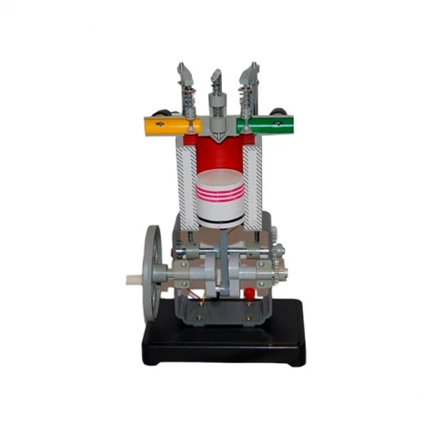 Модель дизельного двигателя используется в кабинете физики общеобразовательного учебного заведения при изучении курса молекулярной физики и термодинамики. Предназначена для демонстрации принципа работы данного двигателя, как практического применения первого закона термодинамики. Прибор представляет собой объемной формы кинематическую модель в виде разреза дизельного двигателя. Все детали ярко окрашены. С помощью вращения ручки обеспечивается взаимодействие элементов двигателя.