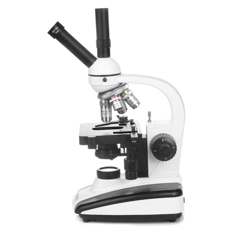 Монокулярний мікроскоп з додатковою насадкою для цифрової камери-окуляра. Унікальність цієї моделі в тому, що в окулярній насадці ("голові") є спеціальний роз'єм під адаптер для камери: це дає можливість спостерігати за зразком через окуляр і бачити таку ж картинку на моніторі вашого ПК. Збільшення: 40x-1600x. Об'єктиви: ахроматичні 4x, 10x, 40x(s), 100x(s, oil). Окуляри: WF10x/18 мм та WF16x/13 мм. Оптична довжина тубуса: 160 мм. Тип мікроскопії: світлого поля. Предметний столик: 115 x 125 мм. Живлення: від мережі 220 В. Насадка: Dual-View (оборот на 360º, нахил на 45º).