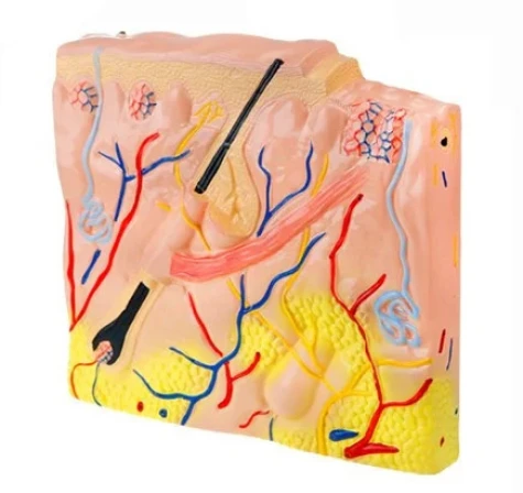 Модель используется в кабинете биологии общеобразовательного учебного заведения. Используется для демонстрации в разделах «Человек и его здоровье» и «Общая биология». Демонстрирует кожу человека в разрезе, что позволяет учащимся ознакомиться с анатомическим строением кожи и структуре ии внутренних слоев: волосами, корнями волос, потовыми и сальными железами, кровеносными сосудами. Характеристики: Материал: термопластик Размеры: 110 * 70 * 85 мм Модель поставляется в картонной коробке размерами 110 * 80 * 100 мм.