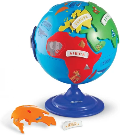 Глобус-пазл состоит из пазлов шести континентах (Антарктика стационарная) с указанием названий континентов, океанов и основных представителей животного мира. Головоломки - континенты выполнены в уникальной форме, соответствующей форме настоящего континента. Во время размищения пазлов - континентов у детей развивается пространственное воображение и понимание формы. Диаметр глобуса 20 см, длина самого большого пазла (Азия) - 14 см. Глобус состоит из прочной и устойчивой основы; Шара, вращается (с нанесинням океанов), 6-ти деталей-континентов, 6-ти пластиковых табличек-названий континентов и письмо с стикерами-наклейками. Состав глобус на подставке - 1 ед. Пазлы-Континенты - 6 ед. таблички-названия континенте - 6 ед. письмо с стикерами-наклейками - 1 ед. паспорт - 1 ед.