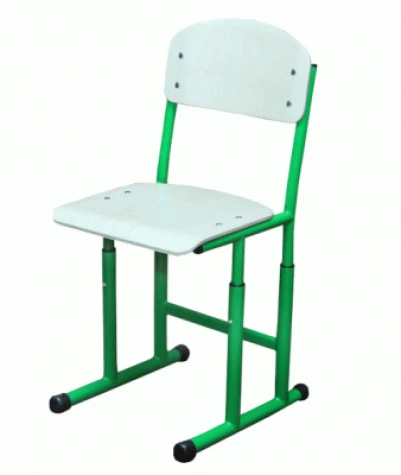 Стул на полозьях на круглой трубе, регулируется на ростовые группы №4-6 Габаритные размеры: 391х430х743-823 мм (380-460 мм). Размер спинки: 380х200 мм. Размер сиденья: 380х350 мм. Вес: 4,97 кг. Сидение и спинка изготовлены из гнуто-клееной фанеры (толщиной 8-9 мм) и покрытые бесцветным лаком на водной основе. Углы сиденья и спинки и передняя кромка сиденья имеют радиус закругления для предотвращения травмирования.