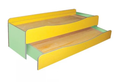Кровать детская 2-х ярусная без матраса. Габаритные размеры: 1435х649х585 мм. Вес: 49 кг. Материал - ДСП ламинированная, толщина 16 мм. Фасад оклеенного кромочного лентой ПВХ - 1мм. Боковины округлены. Внутреннее наполнение - фанера 7мм. Возможны комбинации цветов: желтый / синий, желтый / лайм, бук.