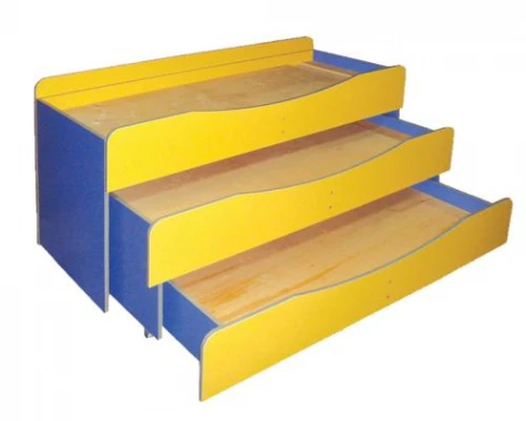Кровать детская 3-х ярусная без матраса Габаритные размеры: 1491х649 (1848) х868 мм. Вес: 75,55 кг. Материал - ДСП ламинированная, толщина 16 мм. Фасад оклеенного кромочного лентой ПВХ - 1 мм. Боковины округлены. Внутреннее наполнение - фанера 7 мм. Комбинации цветов: желтый / синий, желтый / лайм, бук.