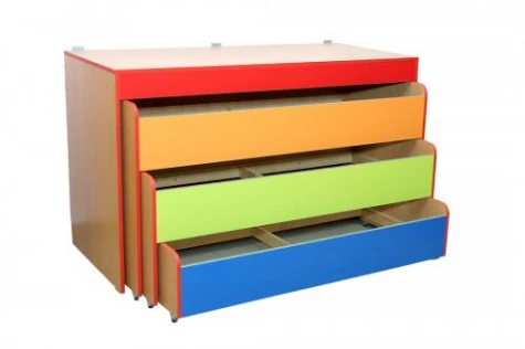 Кровать детская 3-х ярусная без матраца с крышкой. Габаритные размеры: 1552х682 (2522) х950 мм. Вес: 106 кг. Материал - ДСП ламинированная, толщина 16 мм. Фасад оклеенного кромочного лентой ПВХ - 1 мм. Боковины закругленные (разного цвета). Внутреннее наполнение - фанера 7 мм. Цвет: бук, синий, лайм, апельсин, красный.
