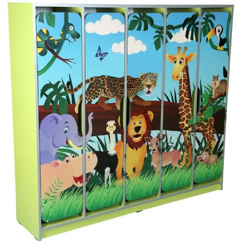 Шкаф детский 5-местная для раздевалки с фотопечатью "Саванна" Габаритные размеры: 1546х350х1400 мм. Вес: 77,17 кг. Материал: корпус, полки, двери - ДСП ламинированная, толщина 16 мм. Задняя стенка - ДВП ламинированная белая 3 мм. Фасад оклеенного кромочного лентой ПВХ толщиной 1 мм, другие части шкафа оклеенного кромочного лентой ПВХ толщиной 0,5 мм, цвета «алюминий». Крючки для мебели хромированные малы. Дверца с вырезом. Цвет ДСП: лайм / беж.