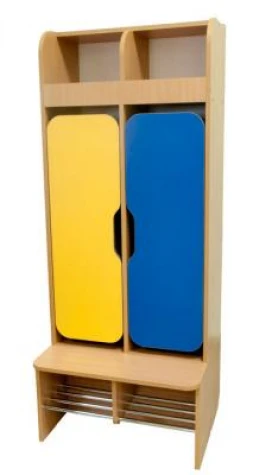 Шкаф детский 2-местная с фигурными дверями (хромированные трубы) Габаритные размеры: 628х550х1560 мм. Вес: 40,5 кг. Материал: корпус, полки, стойки - ДСП ламинированная, толщина 16 мм. Задняя стенка: ДВП ламинированная белая 3 мм. Фасад оклеенного кромочного лентой ПВХ 1 мм; другие части шкафа - ПВХ 0,5 мм. Крючки для мебели хромированные малы. Цветные дверцы с вырезом. Закругленные углы. Труба хромированная d = 16 мм. Комбинации цветов: бук / лайм / желтый, бук / синий / желтый, бук / апельсин / красный.