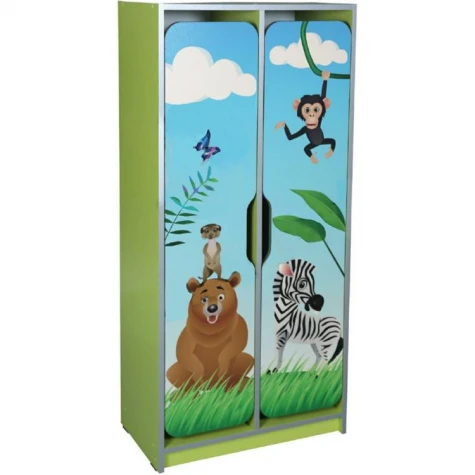 Шкаф детский 2-местная для раздевалки с фотопечатью "Саванна" Габаритные размеры: 628х350х1400 мм. Вес: 37,25 кг. Материал: корпус, полки, двери - ДСП ламинированная, толщина 16 мм. Задняя стенка - ДВП ламинированная белая 3 мм. Фасад оклеенного кромочного лентой ПВХ толщиной 1 мм, другие части шкафа оклеенного кромочного лентой ПВХ толщиной 0,5 мм, цвета «алюминий». Крючки для мебели хромированные малы. Дверца с вырезом. Цвет ДСП: лайм / беж.
