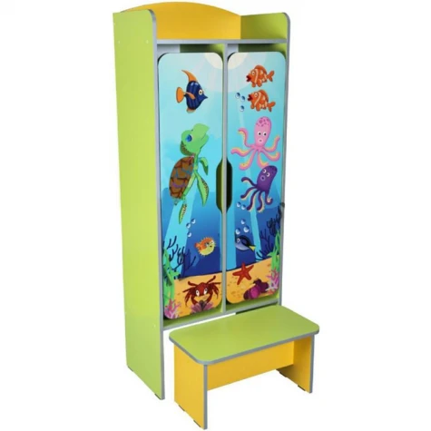 Шкаф детский 2-местная для раздевалки, со скамейкой, с фотопечатью "Подводный мир" Габаритные размеры: 628х350х1610 мм. Вес: 79,5 кг. Материал: корпус, полки, стойки - ДСП ламинированная, толщина 16 мм. Задняя стенка - ДВП ламинированная белая 3 мм. Фасад оклеенного кромочного лентой ПВХ толщиной 1 мм; другие части шкафа оклеенного кромочного лентой ПВХ толщиной 0,5 мм, цвета «алюминий». Лавка выдвижная. Крючки для мебели хромированные малы. Дверца с вырезом, закругленные. Комбинации цветов: лайм / желтый / беж.