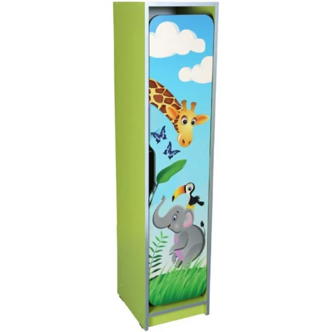 Шкаф детский 1-местная для раздевалки с фотопечатью "Саванна" Габаритные размеры: 322х350х1400 мм. Вес: 22,88 кг. Материал: корпус, полки, двери - ДСП ламинированная, толщина 16 мм. Задняя стенка - ДВП ламинированная белая 3 мм. Фасад оклеенного кромочного лентой ПВХ толщиной 1 мм, другие части шкафа оклеенного кромочного лентой ПВХ толщиной 0,5 мм, цвета «алюминий». Крючки для мебели хромированные малы. Дверца с вырезом. Цвет ДСП: лайм / беж.