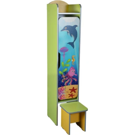 Шкаф детский 1-местная для раздевалки, со скамейкой, с фотопечатью "Подводный мир" Габаритные размеры: 322х350х1610 мм. Вес: 19,9 кг. Материал: корпус, полки, стойки - ДСП ламинированная, толщина 16 мм. Задняя стенка - ДВП ламинированная белая 3 мм. Фасад оклеенного кромочного лентой ПВХ толщиной 1 мм; другие части шкафа оклеенного кромочного лентой ПВХ толщиной 0,5 мм, цвета «алюминий». Лавка выдвижная. Крючки для мебели хромированные малы. Дверца с вырезом, закругленные. Комбинации цветов: лайм / желтый / беж.