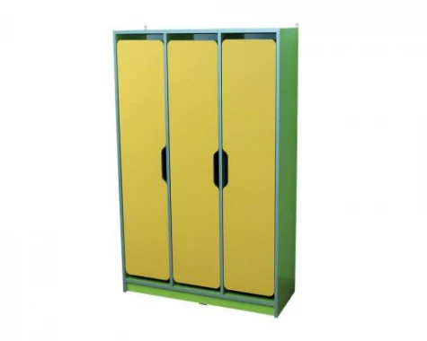 Шкаф детский 3-местная с фигурными дверями Габаритные размеры: 934х350х1400 мм. Вес: 52 кг. Материал: корпус, полки, двери - ДСП ламинированная, толщина 16 мм. Задняя стенка - ДВП ламинированная белая 3 мм. Фасад оклеенного кромочного лентой ПВХ 1 мм, другие части шкафа - ПВХ 0,5 мм. Крючки для мебели хромированные малы. Дверца с вырезом. Комбинации цветов: бук, лайм / желтый, синий / желтый.