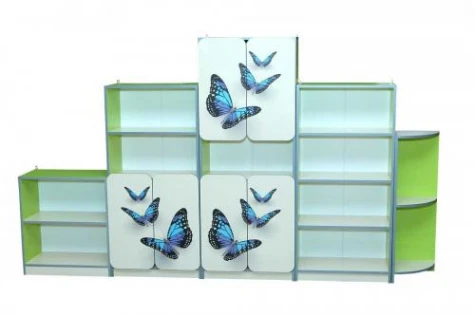 Стенка детская из 5-ти элементов с фотопечатью Состоит из пяти отдельных элементов. Габаритные размеры: 2700х300х1526 мм. Вес: 91,66 кг. Материал: корпус, полки, двери - ДСП ламинированная, толщина 16 мм. Задняя стенка: ДВП ламинированная белая 3 мм. Фасад оклеенного кромочного лентой ПВХ 1 мм. Другие части ПВХ - 0,5 мм. Декорирована рисунком "Бабочки" (фотопечать). Комбинации цветов: лайм / желтый, лайм / крем.