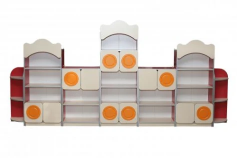 Стенка детская из 7-ми элементов с накладками МДФ Состоит из семи отдельных элементов. Габаритные размеры: 3600х300х1700 мм. Вес: 132,36 кг. Материал: корпус, полки, двери - ДСП ламинированная, толщина 16 мм. Задняя стенка: ДВП ламинированная белая 3 мм. Фасад оклеенного кромочного лентой ПВХ 1 мм; другие части - ПВХ 0,5 мм. Декорирована МДФ накладками. Комбинации цветов: синий / желтый, лайм / желтый, красный / крем.