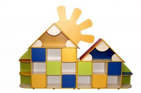 Стенка детская "Солнышко" Габаритные размеры: 2610х360х1880 мм. Вес: 94,84 кг. Материал: корпус, полки, двери - ДСП ламинированная, толщина 16 мм. Задняя стенка: ДВП ламинированная белая 3 мм. Все части / элементы оклеенного кромочного лентой ПВХ 1 мм. Имеет фигурные вырезы и элементы. Цвет ДСП: крем, желтый, красный, синий, лайм.