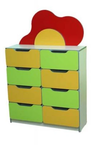 Стенка детская "Цветочная поляна" №6 комод Габаритные размеры: 900х300х1365 мм. Вес: 48,82 кг. Материал: корпус, полиции - ДСП ламинированная, толщина 16 мм. Задняя стенка: ДВП ламинированная белая 3 мм. Фасад оклеенного кромочного лентой ПВХ - 1 мм; другие части ПВХ - 0,5 мм. Имеет фигурные вырезы и элементы. Цвет: крем, желтый, лайм, красный.