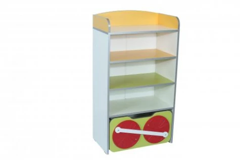 Стенка детская "Сказочный экспресс" элемент №6 Габаритные размеры: 620х350х1130 мм. Вес: 29,00 кг. Материал: корпус, полки - ДСП ламинированная, толщина 16 мм. Задняя стенка: ДВП ламинированная белая 3 мм. Фасад оклеенного кромочного лентой ПВХ - 1 мм; другие части ПВХ - 0,5 мм цвета «алюминий». Фасады отделаны тематическими МДФ накладками красного и белого цветов. Цвет: белый, желтый, лайм.